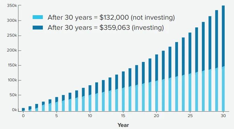 For illustrative purposes only. Assumptions: 30-year investment timeframe; annual contributions of $4,400; 6% annual return on investment; Interest compounded annually; 0% return on cash; no withdrawals. This hypothetical example does not represent the performance of any particular investment and is not a guarantee of future results. The illustration does not consider investment fees or expenses that would lower performance. Actual rates of return will fluctuate. All investing involves risks of fluctuating prices and the uncertainties of return and yield inherent in investing. All security transactions involve substantial risk of loss. Based on the Voya Savings Calculator.